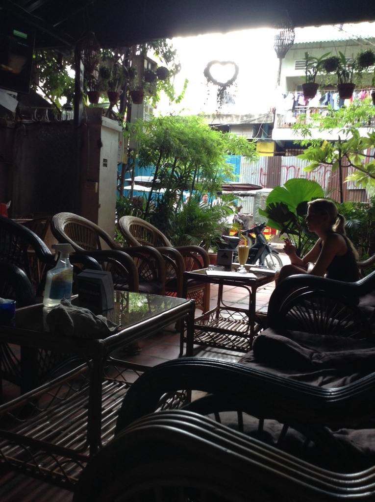 The front of the hostel has this great covered patio area with loads of wicker furniture, a pool table and a bar serving ridiculously cheap cocktails with names like The Midormi Illusion and Gypsy Juice (though I’ll likely only ever buy the locally brewed extra stout–I still like the idea of a cheap bar). The flat screen plays muted B-list action flicks from generations past. To add to the street sounds, goofy reggae remixes of popular 90s music reverberates throughout the rickety structure. I love this. Little makes me happier than cheesy 90s reggae. Anyone who travelled extensively with me in Latin America can attest to my wierd obsession with Inner Circle’s “Sweat.” This May be a place if can stay for most of my 2 week stay in Phnom Penh.